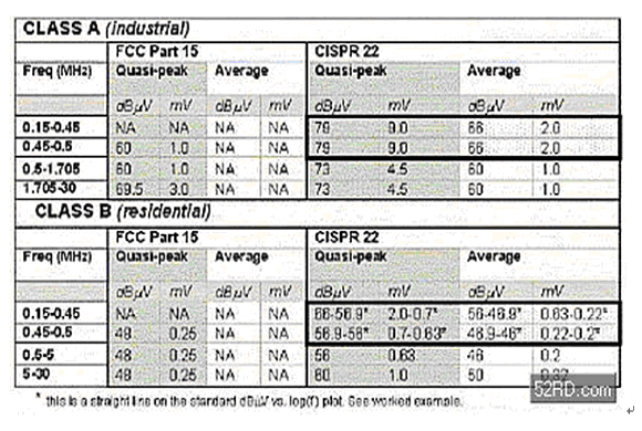 對EMI而言,濾波器是做何用途呢?表一列出了FCC和CISPR 22的EMI限制規(guī)定。此表中比較特殊的是,除了可用dBμV計量以外,也可以用mV來計量。這對那些討厭使用對數(shù)(logarithm)計算的設(shè)計者而言很便利。