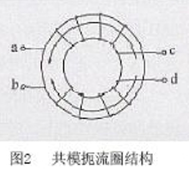 圖1 是開關(guān)電源EMI 濾波器的電路。其中L1、L2為共模扼流圈,其結(jié)構(gòu)見圖2。由于它的兩個(gè)線圈匝數(shù)相等,這兩個(gè)電感對(duì)于差模電流和主電流所產(chǎn)生的磁通是方向相反、互相抵消的,因而不起作用;而對(duì)于共模干擾信號(hào),能夠得到一個(gè)大的電感量呈現(xiàn)高阻抗,以獲得最大的濾波效果,因此對(duì)其有良好的抑制作用。但是,由于種種原因,如磁環(huán)的材料不可能做到絕對(duì)均勻,兩個(gè)線圈的繞制也不可能完全對(duì)稱等,使得L1和L2的電感量是不相等的,于是,(L1- L2)形成差模電感,它和L3與L4形成的獨(dú)立差模抑制電感與Cx電容器又組成L - N 獨(dú)立端口間的一個(gè)低通濾波器,用來抑制電源線上存在的差模干擾信號(hào)。