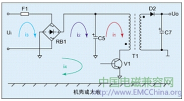 圖1中,當(dāng)電源開關(guān)管V1導(dǎo)通或者關(guān)斷時(shí),在電容器C5、變壓器T1的初級(jí)和電源開關(guān)管V1組成的電路中會(huì)產(chǎn)生脈動(dòng)直流i1,如果把此電流回路看成是一個(gè)變壓器的“初級(jí)線圈”,由于電流i1的變化速率很高,它在“初級(jí)線圈”中產(chǎn)生的電磁感應(yīng),也會(huì)對(duì)周圍電路產(chǎn)生電磁感應(yīng),我們可以把周圍電路都看成是同一變壓器的多個(gè)“次級(jí)線圈”,同時(shí)變壓器T1的漏感也同樣對(duì)各個(gè)“次級(jí)線圈”產(chǎn)生感應(yīng)作用,因此電流i1通過電磁感應(yīng),在每個(gè)“次級(jí)線圈”中都會(huì)產(chǎn)生的感應(yīng)電流,我們分別把它們記為i2、i3、i4 •••。
