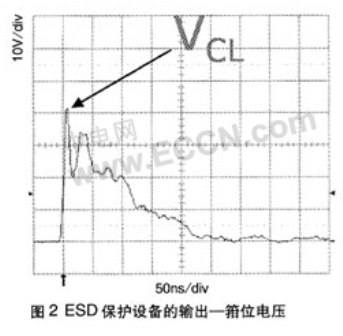 圖2所示的是一次ESD事件中,ESD保護(hù)設(shè)備的輸出(箝位電壓)。
