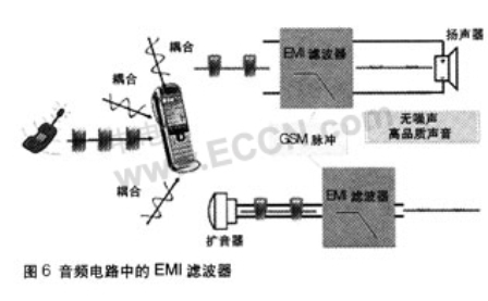 在音頻電路中如有電磁干擾(EMI),會(huì)出現(xiàn)嘶嘶、噼啪、嗡嗡等聲音,聲音質(zhì)量很差。手機(jī)用戶(hù)無(wú)法忍受這樣的干擾。因此,必須設(shè)法過(guò)濾音頻電路的電磁干擾。