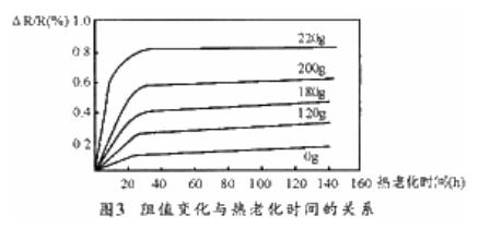 圖3所示為卡瑪線在不同拉力下繞制后,在190℃溫度熱老化過(guò)程中阻值隨時(shí)間的變化曲線。拉力越大,阻值在熱老化時(shí)的變化也越大,這說(shuō)明熱處理是消除應(yīng)力影響的有效措施。
