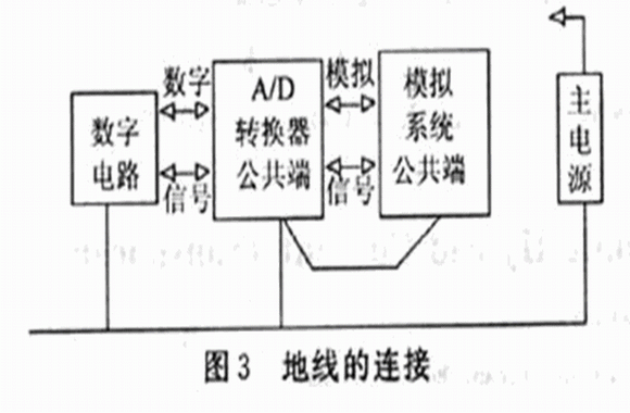 數(shù)字地線通常有很大的噪聲,而且有大的電流尖峰,所有的模擬公共地線應(yīng)該和數(shù)字公共地線分開(kāi)走線,然后只在一點(diǎn)匯集在一處,如圖3所示,這種接法使模擬和數(shù)字地線間的公共阻抗最小。