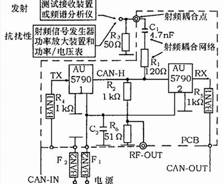 單線CAN通過單根總線連接,一般應(yīng)用于低速場合,典型傳輸速率33 kb/s,最多可連接32個(gè)節(jié)點(diǎn)。圖3所示的測(cè)試PCB上安裝了兩個(gè)單線CAN收發(fā)器AU 5790,電源線BAN2(包含電源濾波電感器)濾波器F1和F2給收發(fā)器提供工作電壓。收發(fā)器1接收經(jīng)BAN1(包含1 kΩ的串聯(lián)電阻)輸入的CAN信息,并經(jīng)CAN-H發(fā)送到收發(fā)器2,收發(fā)器2再將信息經(jīng)BAN1從測(cè)試板輸出。測(cè)試儀器通過射頻耦合網(wǎng)絡(luò)與CAN-H連接。