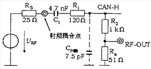 CAN-H的直流負(fù)載為R2和R6,電阻約為1 kΩ,射頻耦合網(wǎng)絡(luò)中的R1、C1和R3構(gòu)成CAN-H的交流負(fù)載,這些元件值的選取應(yīng)接近典型總線負(fù)載的值。其中R2和R6還構(gòu)成電阻分壓器,得到輔助的射頻輸出端(RF-OUT)。R6的選取應(yīng)使RF-OUT點(diǎn)的輸出阻抗為50 Ω,它與輸入阻抗50 Ω的測(cè)試儀器連接,衰減約為32 dB。設(shè)置輔助輸出端的目的:①測(cè)量從耦合節(jié)點(diǎn)到CAN-H線的傳遞函數(shù);②測(cè)量時(shí)域范圍內(nèi)CAN-H的電壓。