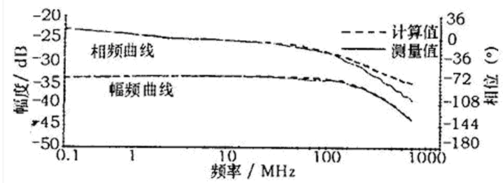 高頻范圍內(nèi)的轉(zhuǎn)折頻率由測(cè)試PCB決定,主要應(yīng)避免諧振的發(fā)生。為確定高頻轉(zhuǎn)折頻率,需要先測(cè)量或計(jì)算耦合網(wǎng)絡(luò)的傳遞函數(shù),Philips半導(dǎo)體實(shí)驗(yàn)室利用圖4所示的電路進(jìn)行了耦合網(wǎng)絡(luò)傳遞函數(shù)的測(cè)量和計(jì)算,圖4中CPCB為CAN-H到搭鐵的寄生電容,經(jīng)測(cè)量其值為7.5 pF,測(cè)量和計(jì)算的結(jié)果如圖5所示。將傳遞函數(shù)的計(jì)算結(jié)果與測(cè)量結(jié)果相比較,可以發(fā)現(xiàn)兩者非常吻合。并且由圖5可知,至少在500 MHz以內(nèi),測(cè)試電路不會(huì)受到諧振的影響。
