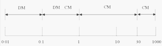 DC-DC轉換器的共模干擾信號(CM)和差模干擾信號(DM)的分布圖如圖1所示。這是分析干擾信號特性十分有用的列線圖。如果設備在某段頻率范圍內有傳導干擾電平超標,查閱該圖可得出是哪一種類型的傳導干擾信號占主導地位,從而指導改變EMI濾波器的網絡結構及參數等相應措施加以解決。