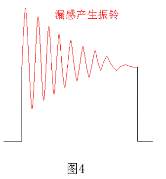 由于變壓器的初級(jí)有漏感,當(dāng)電源開(kāi)關(guān)管V1由飽和導(dǎo)通到截止關(guān)斷時(shí)會(huì)產(chǎn)生反電動(dòng)勢(shì),反電動(dòng)勢(shì)又會(huì)對(duì)變壓器初級(jí)線圈的分布電容進(jìn)行充放電,從而產(chǎn)生阻尼振蕩,即產(chǎn)生振鈴,如圖4所示。變壓器初級(jí)漏感產(chǎn)生反電動(dòng)勢(shì)的電壓幅度一般都很高,其能量也很大,如不采取保護(hù)措施,反電動(dòng)勢(shì)一般都會(huì)把電源開(kāi)關(guān)管擊穿,同時(shí)反電動(dòng)勢(shì)產(chǎn)生的阻尼振蕩還會(huì)產(chǎn)生很強(qiáng)的電磁輻射,不但對(duì)機(jī)器本身造成嚴(yán)重干擾,對(duì)機(jī)器周邊環(huán)境也會(huì)產(chǎn)生嚴(yán)重的電磁干擾。