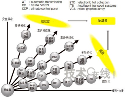 圖2:車載導(dǎo)航儀的多媒體化在兼顧“貼心服務(wù)”和“愉悅心情”的同時(shí)增加功能。EMC成為重要課題。