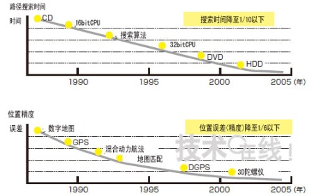 為了實(shí)現(xiàn)上述進(jìn)步,車載導(dǎo)航儀的性能得到了穩(wěn)步提高。以路徑搜索時(shí)間為例,2007年與1990年相比,時(shí)間縮短到了1/10以下。位置誤差(精度)實(shí)現(xiàn)了1/6以下的高精度化(圖3)。