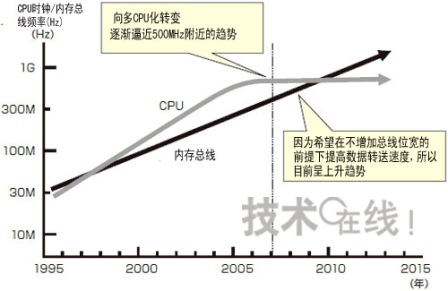 其原動(dòng)力毋庸置疑是CPU的進(jìn)步(即計(jì)算機(jī)系統(tǒng)的大規(guī)?;蜁r(shí)鐘的高速化)。車載導(dǎo)航儀的CPU時(shí)鐘和內(nèi)存總線時(shí)鐘頻率近來得到了快速提高(圖4)。CPU時(shí)鐘頻率正在逼近上限,今后,提高性能可能要依賴在一個(gè)LSI內(nèi)配置多個(gè)CPU的多CPU化進(jìn)程。而另一方面,DRAM的內(nèi)存總線還在以不增加位寬的前提下提高性能,因此,時(shí)鐘頻率的上升勢不可擋。