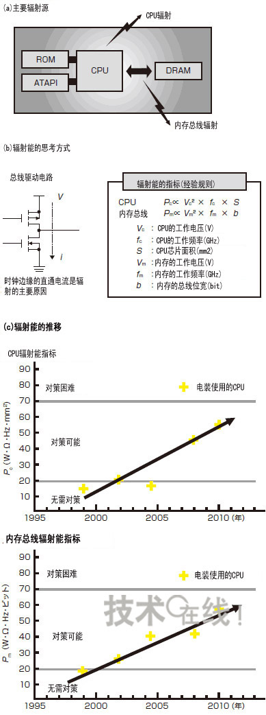 芯片面積和時(shí)鐘頻率的增加容易導(dǎo)致輻射電磁噪聲增大。因此,對(duì)這些輻射源的輻射進(jìn)行預(yù)測管理會(huì)逐漸成為重要環(huán)節(jié)。對(duì)于車載導(dǎo)航儀的核心(Navi-Core),如圖5(a)所示,CPU和總線是主要輻射源。由經(jīng)驗(yàn)可知,直接來自于CPU的輻射能指標(biāo)Pc與工作電壓的平方、工作頻率、芯片面積分別成正比,這些數(shù)值的積被作為“輻射能指標(biāo)”應(yīng)用到了預(yù)測管理(圖5(b)注1)之中。內(nèi)存總線的輻射能指標(biāo)Pm也同樣與工作電壓的平方、工作頻率、內(nèi)存總線位寬的積成正比。[page]