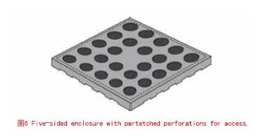 有的設(shè)計(jì)者更喜歡用表面安裝生產(chǎn)線的貼裝設(shè)備將蓋子和圍欄合為整體。只有在重新加工腔體內(nèi)元件時(shí)才打開蓋子。選擇這種設(shè)計(jì)意味著蓋子上必須留有陣列小孔,以便熱量能進(jìn)入腔體將內(nèi)部的電子元件焊接在PCB上,如圖4所示。不幸的是,這些小孔會將腔體的屏蔽性能降低20dB左右。