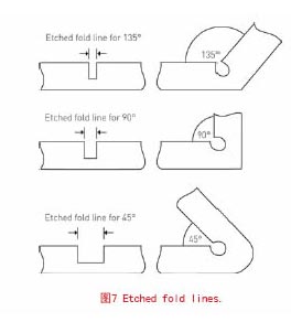 PCM有一些優(yōu)點(diǎn),加工和工具修改花費(fèi)較低,整個(gè)過程所需要的時(shí)間較短。彎線可以被很精確的蝕刻出來,例如,135,90或者45度,如圖7。整個(gè)過程沒有毛邊和金屬應(yīng)力,磁和其他金屬特性不變??梢院芊奖愕挠糜趶?fù)雜的設(shè)計(jì),產(chǎn)品有縫,軌道限界孔,徽標(biāo)和其他細(xì)節(jié)不會增加最后的費(fèi)用,這可以使設(shè)計(jì)者隨意設(shè)計(jì)他們想要的東西。