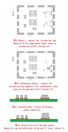 克服任何共面問題的另一手段是采用厚度經(jīng)過選擇的印刷焊膏。在一個(gè)印刷通帶,為屏蔽腔選用增厚的焊膏和其他更大的元件,有助于消除元件共面的相關(guān)問題。這種技術(shù)提供了更結(jié)實(shí)的焊帶,增加了機(jī)械強(qiáng)度,有助于防止填料浮空的相關(guān)問題。