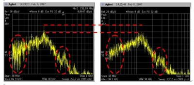 圖1.D類(lèi)系統(tǒng)的近場(chǎng)EMI測(cè)量結(jié)果。從紅色的虛線可看出左邊的固定頻率時(shí)鐘方案和右邊的擴(kuò)展頻譜調(diào)制之間的分別。