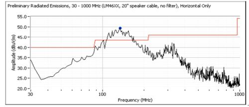 圖3.沒(méi)有邊沿速率控制的擴(kuò)展頻譜D類(lèi)放大器。器件在EMI測(cè)試中,在沒(méi)有使用任何濾波器的情況下驅(qū)動(dòng)20英寸長(zhǎng)的揚(yáng)聲器電纜,其結(jié)果符合FCCB級(jí)的EMI限制。