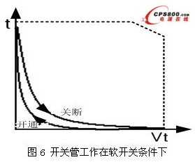 一般來說,可以采用軟開關(guān)技術(shù)來解決開關(guān)管的問題,如圖6所示。圖6給出了開關(guān)管工作在軟開關(guān)條件下的開關(guān)軌跡。軟開關(guān)技術(shù)主要減小開關(guān)管上的開關(guān)損耗,也可以抑制開關(guān)管上的電磁干擾。在所有的軟開關(guān)技術(shù)中,準(zhǔn)諧振抑制開關(guān)管上電磁干擾的效果比較好,所以本文以準(zhǔn)諧振技術(shù)為例,介紹軟開關(guān)技術(shù)抑制EMI。所謂準(zhǔn)諧振就是開關(guān)管在電壓谷底開通,見圖7。開關(guān)中寄生電感與電容作為諧振元件的一部分,可完全控制開關(guān)導(dǎo)通時(shí)電流浪涌與斷開時(shí)電壓浪涌的發(fā)生。采用這種方式不僅能把開關(guān)損耗減到很小,而且能降低噪聲。谷底開關(guān)要求關(guān)斷時(shí)間中儲(chǔ)存在中的能量必須在開關(guān)開通時(shí)釋放掉。它的平均損耗為,由此公式可以看出,減小會(huì)導(dǎo)致大大降低,從而減小開關(guān)上的應(yīng)力,提高效率,減小dv/dt,即減小EMI。