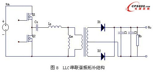 圖8為L(zhǎng)LC串聯(lián)諧振的拓?fù)浣Y(jié)構(gòu)。從圖中可以看出,兩個(gè)主開關(guān)Ql和Q2構(gòu)成一個(gè)半橋結(jié)構(gòu),其驅(qū)動(dòng)信號(hào)是固定50%占空比的互補(bǔ)信號(hào),電感Ls、電容Cs和變壓器的勵(lì)磁電感Lm構(gòu)成一個(gè)LLC諧振網(wǎng)絡(luò)。在LLC串聯(lián)諧振變換器中,由于勵(lì)磁電感Lm串聯(lián)在諧振回路中,開關(guān)頻率可以低于LC的本征諧振頻率fs,而只需高于LLC的本征諧振頻率fm便可實(shí)現(xiàn)主開關(guān)的零電壓開通。所以,LLC串聯(lián)諧振可以降低主開關(guān)管上的EMI,把電磁輻射干擾(EMI)減至最少。在LLC諧振拓?fù)渲校灰C振電流還沒有下降到零,頻率對(duì)輸出電壓的調(diào)節(jié)趨勢(shì)就沒有變,即隨著頻率的下降輸出電壓將繼續(xù)上升,同時(shí)由于諧振電流的存在,半橋上下兩個(gè)主開關(guān)的零電壓開通條件就得以保證。因此,LLC諧振變換器的工作頻率有一個(gè)下限,即Cs與Ls和Lm的串聯(lián)諧振頻率fm。在工作頻率范圍fm<f<fs內(nèi),原邊的主開關(guān)均工作在零電壓開通的條件下,并且不依賴于負(fù)載電流的大小。同時(shí),副邊的整流二極管工作在斷續(xù)或臨界斷續(xù)狀態(tài)下,整流二極管可以零電流條件下關(guān)斷,其反向恢復(fù)的問題得以解決,不再有電壓尖峰產(chǎn)生。