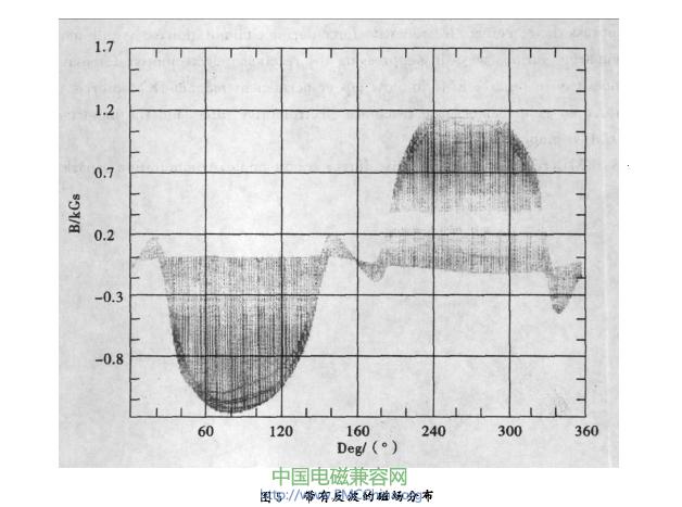 則會嚴(yán)重影響EMi,且不易被發(fā)現(xiàn)。以圖5為例.兩磁極在靠近中性線的位置處均有與該磁極極性相反的一段反波.仔細(xì)分析借偏的原理可知,該反波事實上相當(dāng)于一個與正常換向極作用相反的附加磁極,當(dāng)其被轉(zhuǎn)子換向線圈切割時,產(chǎn)生的電動勢與電抗電動勢同向,也就是會惡化換向;當(dāng)其分布角度超過借偏角度時,會完全抹殺借偏的作用。