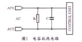 為防止控制板電路產(chǎn)生的傳導干擾,可在電路的進人口(即AC兩端)并接上一個電容C,圖1所示是一個簡單的電容抗擾電路連接圖。圖中的電容屬于安全電容,但必須在該電容的兩端并聯(lián)一個安全電阻,以用于防止電源線拔插時電源線插頭長時間帶電。因為安全標準規(guī)定,當正在工作之中的機器電源線被拔掉時,在兩秒鐘內(nèi),電源線插頭兩端所帶的電壓(或對地電位)必須小于原來電壓的30%。