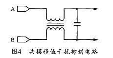 電磁場在導線中感應出的電壓一般是共模電壓,而負載上的電壓則以系統(tǒng)中的公共導體或大地為參考點。一般以系統(tǒng)中的參考地線面為參考點。對于多芯電纜來說,這意味著電纜中的所有導體都暴露在同一個場中,它們上面所感應的電壓取決于每根導體與參考點之間的阻抗。抑制干擾的方法可以使用共模移值法,其原理圖如圖4所示。