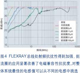 物理層應(yīng)用指南明確指出了對FlexRay網(wǎng)絡(luò)數(shù)據(jù)線扼流圈的總體要求,比如引線電阻(<1W)、電感(>50mH)以及雜散電感(<1mH)。對電磁輻射和電磁干擾的測定與CAN總線一樣。不過,由于10Mbit/s的更高傳輸率,需要更加仔細(xì)地檢查信號完整性。圖4所示為對具有各種電感的扼流圈與不使用扼流圈的測試板進(jìn)行DPI測定的相應(yīng)評估結(jié)果。圖五所示為使用另一塊測試板進(jìn)行電磁干擾測量的結(jié)果,同樣是針對具有不同電感的扼流圈。很明顯可以發(fā)現(xiàn),數(shù)據(jù)線扼流圈的使用改善了電磁兼容性并減少了干擾輻射。當(dāng)電感更高時,作用就更大。不過,更高的電感值會對信號完整性產(chǎn)生一定的負(fù)面影響。[page]