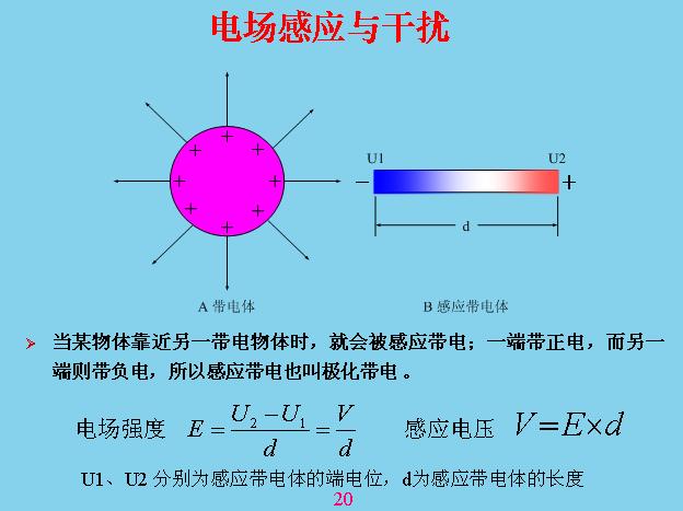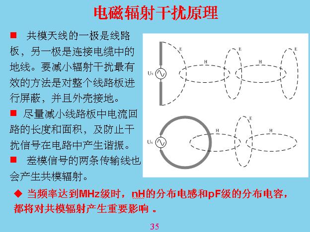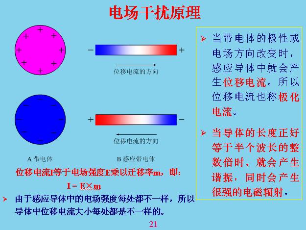 電磁干擾的原理是帶電體電磨和位能不斷的改變,會(huì)對(duì)感應(yīng)體產(chǎn)生位移電流,當(dāng)這邊是正的時(shí)候,電流的方向往這邊流,當(dāng)是負(fù)的時(shí)候電流往另外一邊流。位移電流和一般電工學(xué)里面的位移電流不一樣,位移電流不需要回路,在任何一個(gè)導(dǎo)體里面都會(huì)產(chǎn)生位移電流,并且位移電流的大小在這個(gè)導(dǎo)體里面的每個(gè)地方都不一樣,不管這個(gè)怎么變化,中間位移電流等于零,只在兩端位移電流是最的大,中間那個(gè)地方等于零。如果你不好理解,你把這個(gè)當(dāng)成一根天線(xiàn)就理解了,天線(xiàn)發(fā)射電磁波的時(shí)候也是沒(méi)有回路的,就是靠不斷的對(duì)它進(jìn)行充放電,這個(gè)原理是一樣的。還有一種情況,當(dāng)兩個(gè)變換的速度和來(lái)回移動(dòng)的方向、距離正好是半個(gè)波長(zhǎng)的時(shí)候它會(huì)產(chǎn)生諧振,這個(gè)在天線(xiàn)理論里面可以學(xué)到。因?yàn)槲灰齐娏魇怯兴俣鹊?,不能說(shuō)速度等于無(wú)窮大,我這邊變你也變,如果移動(dòng)有速度就會(huì)產(chǎn)生疊加和抵消的作用,就會(huì)產(chǎn)生諧振。