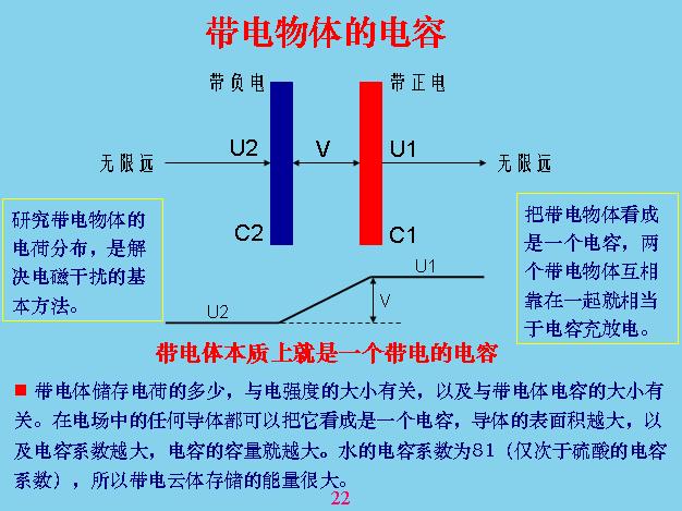 我們給大家介紹一個(gè)很重要的概念,就是電容。這個(gè)電容和我們現(xiàn)在電路里面用的電容是兩個(gè)概念,大家不要混淆。任何帶電體我們都可以把它看成一個(gè)電容,電容的大小跟它帶的電壓和電荷的多少有關(guān),如果帶的電荷越多,電壓越高它的電流就越大。電容的概念其實(shí)與電荷的概念也是互相對(duì)應(yīng)的,我們把這個(gè)電容器看成是兩個(gè)電容進(jìn)行串聯(lián),也就是說(shuō)帶電體帶正電,帶正電是對(duì)于無(wú)限遠(yuǎn)的地方來(lái)說(shuō)的,為什么呢?因?yàn)檫@個(gè)帶電以后電場(chǎng)分布是發(fā)散性的,中間這一點(diǎn)是最強(qiáng),離的越遠(yuǎn)的時(shí)候電感強(qiáng)度就越來(lái)越低,當(dāng)無(wú)限遠(yuǎn)的時(shí)候就等于零,你不能拿它來(lái)參考地球,參考地球的話(huà)相當(dāng)于范圍太小,本身地球也可以看成電容,所以分析電容的時(shí)候最好用無(wú)限遠(yuǎn)的地方作為參考點(diǎn)。也就是說(shuō)我們計(jì)算電容的時(shí)候以無(wú)限遠(yuǎn)的地方考慮,計(jì)算電容也是以無(wú)限遠(yuǎn)的地方考慮。把這兩個(gè)電容靠在一起的時(shí)候就變成了電容器,你就可以利用這兩個(gè)電容的電位梯度和電容器來(lái)分析。任何一個(gè)帶電體都可以看成一個(gè)電容,一個(gè)孤立球?qū)w的電容等于表面積除以半徑,再乘以電容系數(shù)。地球的容量算出來(lái)就是7×10-4(F),把兩個(gè)孤立電容進(jìn)行推導(dǎo),算出來(lái)就是這樣,電容器正好等于上面儲(chǔ)存的電容量除以電位差。明白電容的概念以后,也要分析電路的電磁感應(yīng)方面,要有量的概念。有了量的概念我們可以對(duì)電磁干擾進(jìn)行分析,比如說(shuō)這邊是一個(gè)干擾電壓,通過(guò)這條電路進(jìn)行供電,旁邊也有一個(gè)電路,這個(gè)電路就會(huì)受到干擾,干擾怎么計(jì)算?它的導(dǎo)向電路是什么?我們可以把兩個(gè)導(dǎo)線(xiàn)看成一個(gè)電容器,就是有一個(gè)耦合電容。等效電路相當(dāng)于這邊,你要減少兩個(gè)回路互相干擾的程度就必須要減少上面的Cm電容,把兩條線(xiàn)隔得越遠(yuǎn)越好,而且越短越好,只要面積越小電容器越小,離得越遠(yuǎn)電容器也越小。