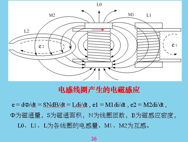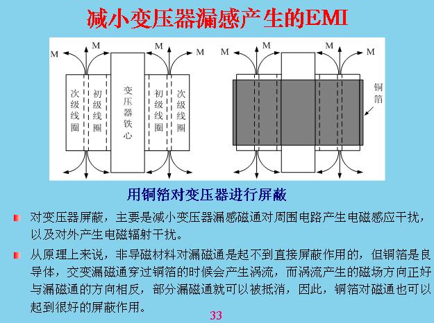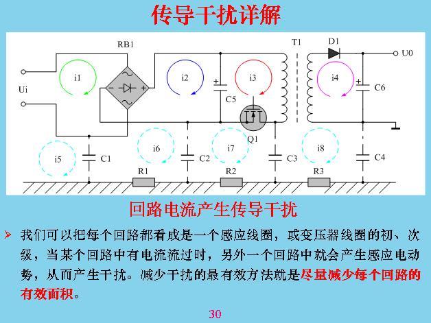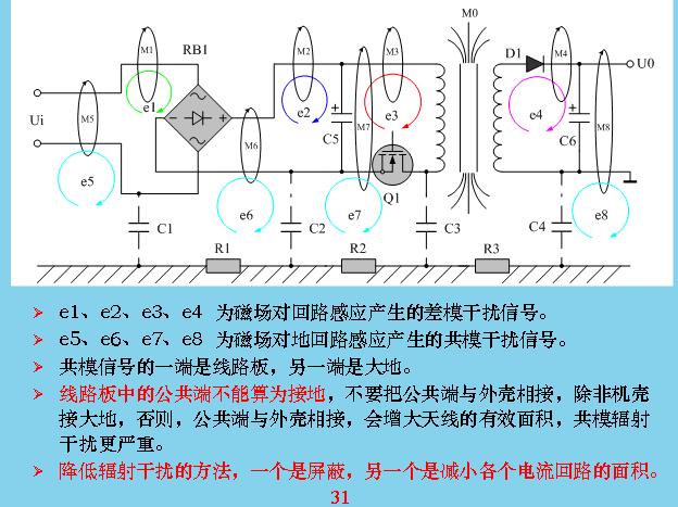 這個(gè)更加具體,有電力穿過(guò)的時(shí)候會(huì)產(chǎn)生電力線(xiàn),電力線(xiàn)會(huì)產(chǎn)生共模干擾,這幾個(gè)都是共模干擾,那些都是差模干擾。這些干擾主要是如何產(chǎn)生的?本身線(xiàn)路里面只有電流流過(guò),構(gòu)成一個(gè)線(xiàn)圈或?qū)Ь€(xiàn)都會(huì)產(chǎn)生干擾,最大的是變壓器漏感,這是其他回路的好幾十倍。所以變壓器漏感最好進(jìn)行屏蔽?怎么屏蔽呢?在線(xiàn)圈的外邊用一層金屬,鋁片也好,銅片也好,一般用銅片包起來(lái),包起來(lái)應(yīng)該讓它短路,就是用焊絲焊起來(lái),漏感在上面也會(huì)產(chǎn)生渦流,一產(chǎn)生渦流就會(huì)產(chǎn)生抵消干擾的磁場(chǎng),就相當(dāng)于把漏感抵消掉。