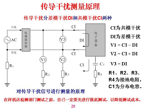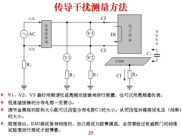 傳導(dǎo)干擾測(cè)量原理。這里面?zhèn)鲗?dǎo)干擾有兩個(gè)干擾,一個(gè)是共模,一個(gè)是差模,這樣一個(gè)回路是流進(jìn)入又流出來(lái)的,這叫做差模。這兩個(gè)同時(shí)進(jìn)去從另外一邊流出來(lái)叫共模,共模干擾很簡(jiǎn)單,就是以大地為一端,另外一端是以上面的線(xiàn)路、設(shè)備,不管什么線(xiàn)為一端測(cè)到的電壓,這叫做共模干擾。因?yàn)闇y(cè)量的時(shí)候必須要與一根電路連接,先測(cè)三個(gè)電壓,這是測(cè)這個(gè)與大地之間的電壓,這是測(cè)兩條線(xiàn)之間的電壓,然后得出結(jié)算公式。V1=CI-DI,就是共模干擾減去差模干擾。V2=CI+DI,V3=DI,R1、R2、R3、R4為接地電阻,C1為分布電容,如果到檢測(cè)所去測(cè)之前自己一定要先進(jìn)行摸底測(cè)試,用一塊墊板或金屬板放在下面接地,等于說(shuō)分布是固定的,利用標(biāo)準(zhǔn)一塊板與機(jī)器造成分布電容,一般是一個(gè)平方米等等,是由他們定的,你可以做試驗(yàn),測(cè)多大都沒(méi)有關(guān)系,但它是固定的,測(cè)電視機(jī)是什么樣,測(cè)手機(jī)是什么樣,這是不一樣的。傳導(dǎo)干擾測(cè)量方法。分布電容在這一塊金屬板,與它之間產(chǎn)生分布電容,當(dāng)然用這個(gè)板帶分布電容,測(cè)出來(lái)的結(jié)果數(shù)字越大,這只是用來(lái)做對(duì)比,以此為基礎(chǔ)。我們做摸底可以用大一點(diǎn)測(cè),容易測(cè)得到,但你測(cè)得不算數(shù)。