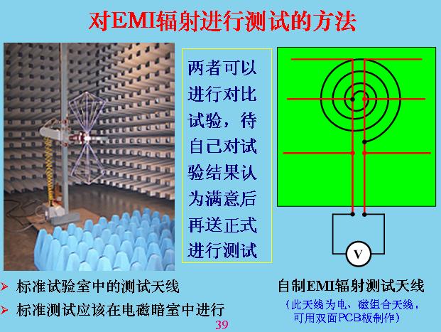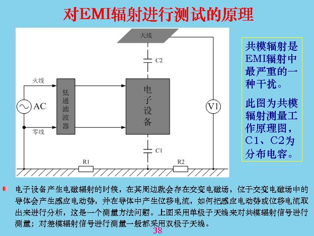 另外對(duì)于輻射干擾,我們最注意的就是共模干擾,差模干擾相對(duì)來(lái)說(shuō)比共模干擾小很多,我們做過(guò)一個(gè)試驗(yàn),在同一個(gè)導(dǎo)線(xiàn)里面流過(guò)的電容,相差的共模干擾是2500倍。上面就是對(duì)輻射進(jìn)行測(cè)試,剛才是共模干擾,其他都是傳導(dǎo)測(cè)試,其實(shí)就是輻射干擾測(cè)試,一般就是用天線(xiàn)來(lái)測(cè),天線(xiàn)的測(cè)試原理就是這樣的,量天線(xiàn)和大地之間的電壓,這個(gè)設(shè)備與大地之間有分布電容,前面已經(jīng)說(shuō)過(guò)了,放這個(gè)在上面,與板接地產(chǎn)生分布電容。天線(xiàn)也有分布電容,分布電容不是跟設(shè)備大小和距離有關(guān),所以測(cè)試的時(shí)候都有一個(gè)標(biāo)準(zhǔn),固定設(shè)備中間距離有多遠(yuǎn),天線(xiàn)面積用多大,還有一套天線(xiàn),很多天線(xiàn),不只是一個(gè),計(jì)最大的那個(gè),就是測(cè)試電壓最大的那個(gè),天線(xiàn)對(duì)輻射會(huì)產(chǎn)生諧振。
