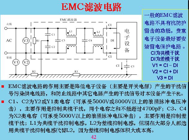 為了降低傳導(dǎo)干擾,現(xiàn)在一般在輸入電路里面都要加濾波器,這邊是設(shè)備產(chǎn)生的干擾,通過(guò)這幾個(gè)濾波以后就會(huì)把幾個(gè)電壓降低,這兩個(gè)電容是共模的濾波電容,這幾個(gè)有共模電感,也有差模電感,因?yàn)楣材k姼械捏w積比較大,成本比較高,所以大家都沒(méi)有用,都在用共模電感代替。因?yàn)楣材k姼斜旧碛新└校└袑?duì)差模來(lái)說(shuō)也有抑制作用,所以相對(duì)來(lái)說(shuō)用共模電感代替差模電感,成本可以大大降低。這兩個(gè)電容很關(guān)鍵,在安全里面兩個(gè)的和不能超過(guò)470b,為什么?安全測(cè)試的時(shí)候在安全設(shè)備上加2500v交流電來(lái)測(cè)與地的漏電,如果超過(guò)2.5毫安就算不合格。這樣算的話(huà)50就是2500v電壓,算出來(lái)的電壓不能超過(guò)470b。按照共模預(yù)計(jì),這兩個(gè)做得更大一點(diǎn),最大不能超過(guò)4700v。這是差模電容,差模電容沒(méi)有要求,用的越大越好。但是用得越大也有一個(gè)問(wèn)題,把電容線(xiàn)拔掉的時(shí)候上面帶電不能超過(guò),所以這里必須加一個(gè)放電電阻,這邊大的以后也可以加一個(gè)放電電阻,充電拔掉以后,下面人不能摸,會(huì)電到人,所以用放電電阻把它放掉。