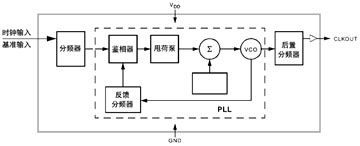W181采用了頻率鎖相環(huán)(PLL)技術(shù)來(lái)調(diào)制輸入時(shí)鐘,其結(jié)果是得到一個(gè)輸出時(shí)鐘,它的頻率可緩慢地掃過(guò)一個(gè)接近于輸入信號(hào)的窄帶?;倦娐方Y(jié)構(gòu)如圖2所示。