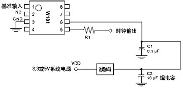 W181-01/02/03有8引腳SOIC封裝及14引腳TSSOP封裝,及其典型應(yīng)用電路框圖和三種封裝管腳排列如圖1所示。
