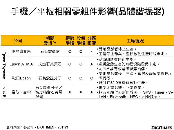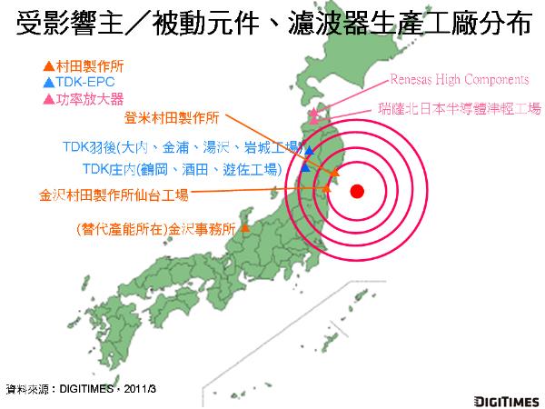 DIGITIMES Research最新報告指出,日本311強(qiáng)震造成日廠手機(jī)/平板相關(guān)零組件供應(yīng)商分別遭受廠房、設(shè)備損壞,亦或海嘯沖擊、地方分區(qū)限電等影響,工廠作業(yè)停擺,影響超過20處工廠,在災(zāi)后截至2011年3月16日仍未能正常作業(yè)。
