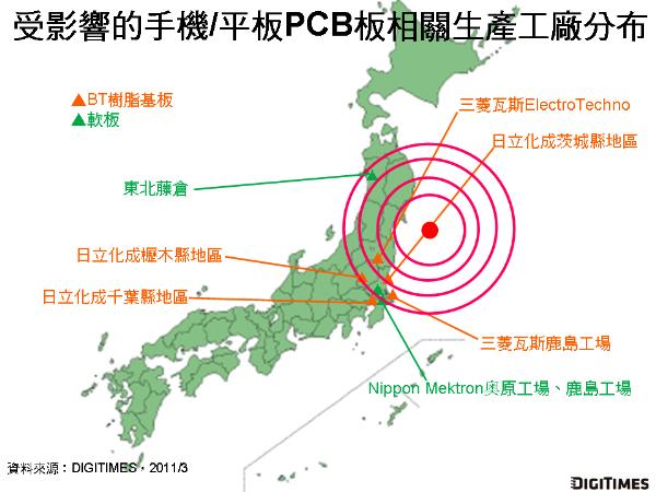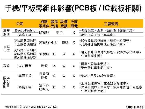 在手機(jī)/平板用PCB、IC載板材料BT樹脂等相關(guān)零組件方面,包含三菱瓦斯化學(xué)、日立化成、藤倉、Nippon Mektron等日廠旗下工廠受地震影響作業(yè)中斷,停止生產(chǎn)。