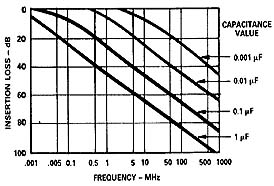EMI電源濾波器對(duì)干擾噪聲的抑制能力通常用插入損耗(InsertionLoss)特性來衡量。插入損耗的定義為:沒有濾波器接入時(shí),從噪聲源傳輸?shù)截?fù)載的噪聲功率P1和接入濾波器后,噪聲源傳輸?shù)截?fù)載的噪聲功率P2之比,用dB(分貝)表示。圖1是理想電容的插入損耗特性,可以看出,1μF電容對(duì)應(yīng)的插入損耗曲線斜率接近20dB/10倍頻。