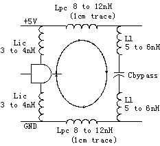 圖5為電流環(huán)的模型。從電流環(huán)模型中我們可以看出,環(huán)路中存在寄生電感,它們?cè)诟哳l狀態(tài)下表現(xiàn)為環(huán)路的阻抗可導(dǎo)致供給電源產(chǎn)生尖峰,并會(huì)輻射電磁波從而干擾系統(tǒng)的其他部分。環(huán)路中Ll為電容管腳引線的封裝電感;Lpc為電容管腳到器件電源或者地管腳之間的PCB傳輸線的寄生電感;Lic為器件管腳引線的寄生電感。另外,在前面我們討論過電容本身也是具有寄生電感ESL的。這樣回路的總電感為:L=2Ll+2Lpc+2Lic+ESL。由于環(huán)路的寄生電感將會(huì)給整個(gè)系統(tǒng)帶來電磁干擾,產(chǎn)生電壓尖峰,這個(gè)電壓尖峰值同串聯(lián)電感之間存在一定的關(guān)系,近似計(jì)算公式如下: