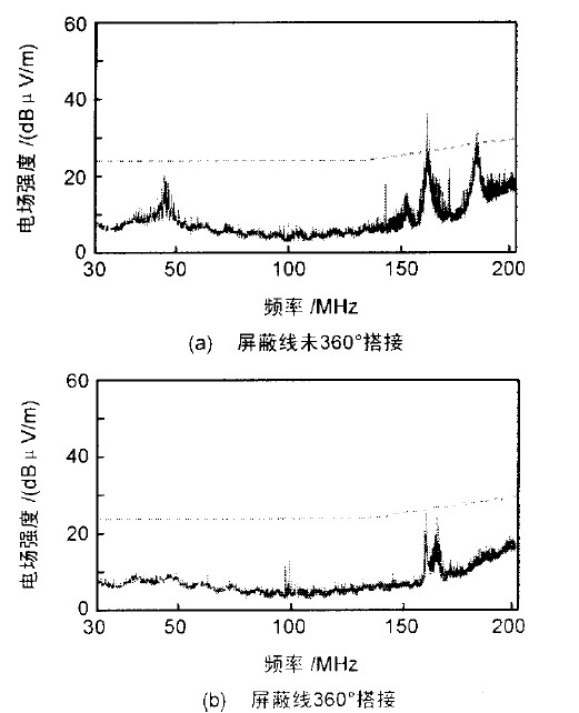 減小空間輻射測(cè)試曲線如圖4 所示。圖4(a)是一臺(tái)外接屏蔽電纜的設(shè)備的測(cè)試曲線,電纜與接口連接器相連的地方都是將屏蔽層擰成一條小辮(又稱Pigtail),然后固定到連接器的螺釘上。屏蔽電纜能控制共模輻射是因?yàn)楣材k娏魈峁┝艘粋€(gè)低阻抗通路,使共模電流通過屏蔽層流回共模電壓源。電纜屏蔽層提供的共模電流通路的阻抗由電纜本身的阻抗及電纜與金屬機(jī)箱之間的搭接阻抗2 部分組成。因?yàn)殡娎|與金屬機(jī)箱之間的搭接阻抗(Pigtail的阻抗)較大,這就使得屏蔽層上形成了一個(gè)較大的共模電壓,在該電壓的驅(qū)動(dòng)下,電纜屏蔽層上會(huì)產(chǎn)生共模電流,因而屏蔽層變成了天線向外輻射。將Pigtail連接改成360 壓接在連接器的金屬外殼上,保證低阻抗搭接,測(cè)試結(jié)果如圖4(b)所示。
