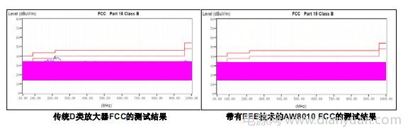 從上圖的測試結(jié)果可以看出,帶有EEE技術(shù)的AW8010的實(shí)測結(jié)果與測試環(huán)境的EMI背景噪聲基本一樣。在高頻射頻段,傳統(tǒng)D類放大器的EMI輻射與背景噪聲差別也不大,但在80~500MHz的頻段內(nèi),有相當(dāng)大的EMI輻射,因此系統(tǒng)工程師在使用D類放大器的時(shí)候會(huì)發(fā)現(xiàn)射頻模塊的靈敏度受到的影響較小,但對(duì)FM、手機(jī)模擬電視的靈敏度影響很大,甚至不能正常工作,采用EEE技術(shù)后,在該頻段有超過20dB的裕量,極大地改善了D類放大器對(duì)FM、手機(jī)模擬電視的影響。
