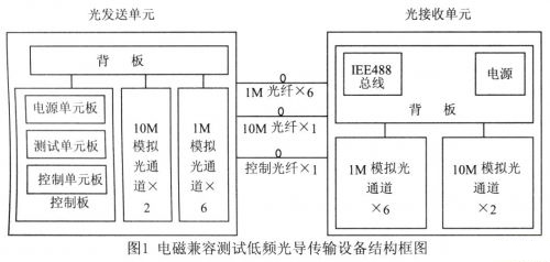EMC測(cè)試低頻光導(dǎo)傳輸設(shè)備由光發(fā)送單元和光接收單元組成。光發(fā)送單元由背板、控制板(包括電源單元、測(cè)試信號(hào)發(fā)生器單元及控制電路單元)、1OMHz通道發(fā)送板(2通道)以及1MHz通道發(fā)送板(6通道)組成;光接收單元由背板(包括電源單元、IEEE488接口單元)、10MHz通道接收板(2通道)以及1MHz通道接收板(6通道)組成。如圖1所示。