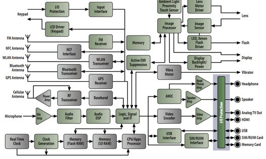 圖7:智能手機框圖及需要保護的I/O接口(見右下側(cè)淺藍色背景區(qū)域)