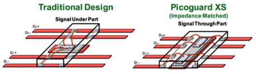 安森美半導(dǎo)體提供的高速接口ESD保護保護器件陣容有兩種類型。第一類最容易實現(xiàn),被稱為傳統(tǒng)設(shè)計保護。在這種類型設(shè)計中,信號線在器件下運行。這些器件通常是電容最低的產(chǎn)品。