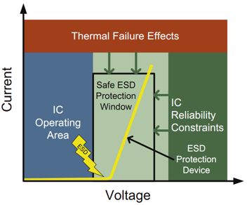 另外,先進的系統(tǒng)級芯片(SoC)設(shè)計都是采用幾何尺寸很小的工藝制造的。為了優(yōu)化功能和芯片尺寸,IC設(shè)計人員一直在不斷減少其設(shè)計的功能的最小尺寸。IC尺寸的縮小導(dǎo)致器件更容易受到ESD電壓的損害。