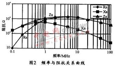 EMI 濾波器需要抑制的頻率范圍通常在10kHz~50 MHz之間。為了使共模濾波電路在此頻率范圍內(nèi)都能提供適當?shù)乃p,磁芯在此頻率范圍內(nèi)的阻抗必須都要很高。共模磁芯的總阻抗(Zs)由串聯(lián)感性阻抗 (Xs)和串聯(lián)阻性阻抗(Rs)兩部分組成。在低頻部分,磁芯阻抗主要以感性阻抗為主,隨著頻率的增加,阻性阻抗逐步增加,漸漸起主要作用,圖2所示是頻率與阻抗的關系曲線。圖中,兩種阻抗的結(jié)合,可使磁芯在此全頻范圍內(nèi)提供合適的總阻抗(Zs)。