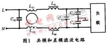 開關電源的開關頻率及其諧波的主要表現(xiàn)是電源線上的干擾,稱之為傳導干擾。傳導干擾分為共模干擾和差模干擾。共模干擾是由載流導體與大地之間的電位差產(chǎn)生的,其特點是兩條線上的干擾信號電壓是同電位同相的;而差模干擾則是由載流導體之間的電位差產(chǎn)生的,其特點是兩條線上的干擾信號電位相同,但相位相反。事實上,針對不同的干擾信號,EMI濾波電路也分為抗共模干擾濾波電路和抗差模干擾濾波電路,圖1所示是其濾波電路。