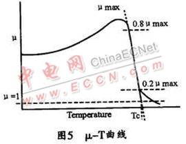 選擇電感的磁芯材料不但要考慮其磁特性,還要考慮其溫度特性,包括高低溫下的磁性變化和磁性材料的居里溫度特性。磁芯由鐵磁性(亞鐵磁性或反鐵磁性)轉(zhuǎn)變成順磁性的溫度稱為居里溫度。在圖5所示的 μ-T曲線上,80%μmax與20%μmax連線與μ=1的交叉點相對應的溫度,即為居里溫度Tc。