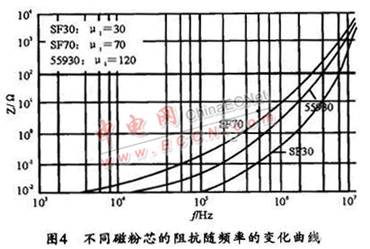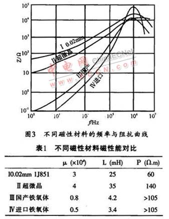共模電感線圈如圖l中Lcl,Lc2是繞在一只磁芯上的兩組獨立的線圈,所繞圈數(shù)相同,繞向相反。這樣,當EMI濾波器接入電路后,兩組線圈產(chǎn)生的磁通在磁芯中將相互抵消,故不會使磁芯飽和。對于干擾信號而言,共模磁芯一般工作在低磁場區(qū)域,所以,共模濾波電感選用的磁性材料要求具有較高的初始磁導率μi。如果只針對濾波器的插入損耗這一指標,則初始磁導率μi越高,濾波電路呈現(xiàn)的感抗就越大,所得到的插入損耗指標就越好。但在整個電路中,還要綜合考慮磁性材料在電路中的其它特性,如頻率阻抗特性、居里溫度、磁材的形狀等等。μi值不同的各種磁性材料,在不同頻率下的阻抗特性也不一樣,故要根據(jù)所需要的頻率范圍來選取合適μi值的磁性材料。圖3所示是不同類型的高μi軟磁材料在同樣條件下的頻率與阻抗關系曲線,該曲線反映出電感磁芯的插入損耗變化趨勢。其它的性能參數(shù)(如電感值、體電阻等)如表1所列。