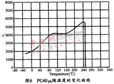 中小功率的EMI濾波器產(chǎn)品中選用最多的磁芯材料是日本TDK公司 的PC40 (它是目前業(yè)界廣泛使用的較好的材料之一),它的初始磁導μi隨溫度的變化曲線如圖6所示。從圖中可看出,溫度變化對μi的影響是很大的,磁芯溫度在 90~150℃的區(qū)間內(nèi),有一段平坦區(qū),這時它的μi大約在4100左右;當溫度低于90℃后,μi值會隨著溫度的降低而逐漸減小,到0℃時,μi值只有 2000左右,進到負溫區(qū)后,μi值還會進一步減小;而當溫度高于150℃后,μi值則會隨著溫度的升高而增加,當達到240℃時,μ的最大值為5600 左右;從240℃開始,μi值又漸漸減小,當溫度達到居里溫度點250℃時,材料失去磁性。